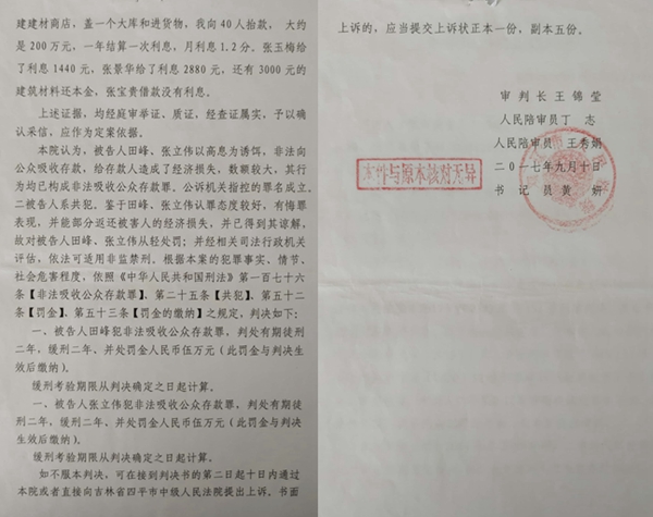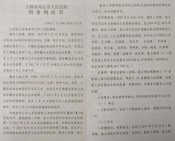 本站讯 在吉林省四平市下辖的双辽市王奔镇上,有一对夫妻,男的叫田峰,女的叫张立伟,今年都60多岁了,夫妻共同经营着一家建材商店,过着平静而富足的日子。2017年2月的一天,突然来了几名警察,说他们涉嫌犯罪了,将这对夫妻双双抓到公安局。同年9月10日,双辽市法院做出(2017)吉0382刑初153号刑事判决书,以非法吸收公众存款罪,将这对夫妻判处二年徒刑缓期二年执行。