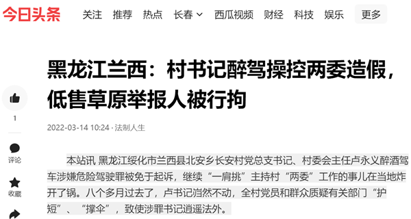 长安村村民说,卢永义醉驾已经过去八个多月了,兰西县有关部门并没有对卢书记做出党纪处分,罢免村主任的程序迟迟不启动。而早在2019年9月,卢永义就曾因漠视侵害群众利益受到党内严重警告处分,被绥化市纪委监委通报。 如今他身背处分醉驾涉罪,依然书记主任“一肩挑”“带病”行使“两委”权力,“玩”权与法的“游戏”,顶风违法、违纪的低气来自哪里?