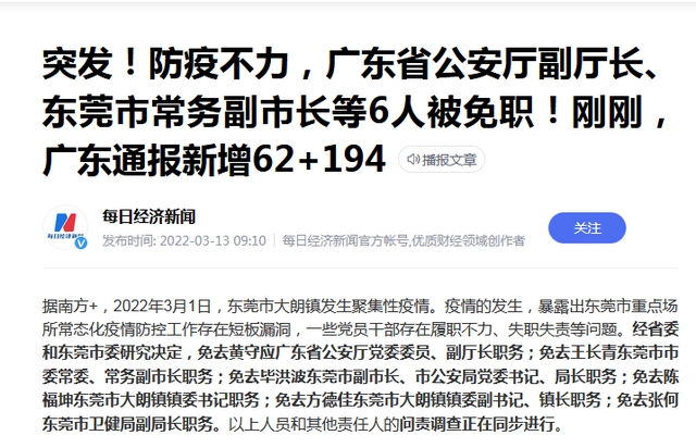 据南方+发布,2022年3月1日,东莞市大朗镇发生聚集性疫情。疫情的发生,暴露出东莞市重点场所常态化疫情防控工作存在短板漏洞,一些党员干部存在履职不力、失职失责等问题。经省委和东莞市委研究决定,免去黄守应广东省公安厅党委委员、副厅长职务;免去王长青东莞市市委常委、常务副市长职务;免去毕洪波东莞市副市长、市公安局党委书记、局长职务……