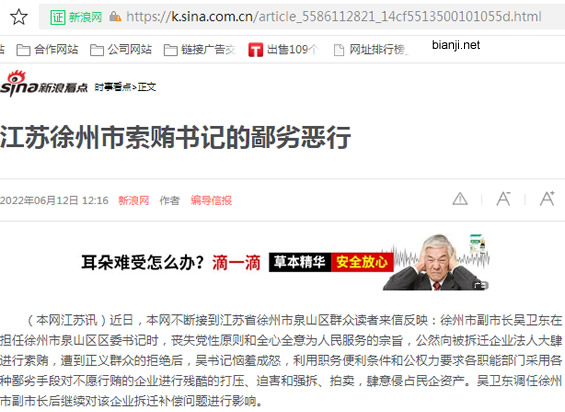 (本网江苏讯)近日,本网不断接到江苏省徐州市泉山区群众读者来信反映:徐州市领导吴某某在担任徐州市泉山区区委领导时,丧失党性原则和全心全意为人民服务的宗旨,公然向被拆迁企业法人大肆进行索贿,遭到正义群众的拒绝后,吴领导恼羞成怒,利用职务便利条件和公权力要求各职能部门采用各种鄙劣手段对不愿行贿的企业进行残酷的打压、迫害和强拆、拍卖,肆意侵占民企资产。吴某某调任徐州市领导后继续对该企业拆迁补偿问题进行影响。