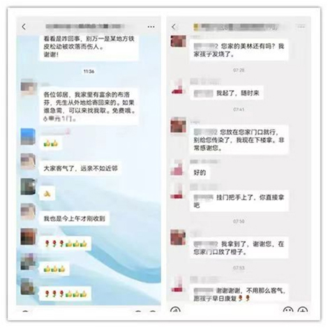 “哪位好心邻居,你们家有富裕的孩子用的美林,我家孩子高烧。”“我家有一瓶,新开的,给孩子拿去吧。”“好的好的,很感谢。”居住在北宫镇得秀社区南街的居民大姐说道:“看见有人在给孩子找退烧药,孩子发烧家里人都着急,很能理解,大家都是邻居,平日里谁家有事儿也会搭把手。”