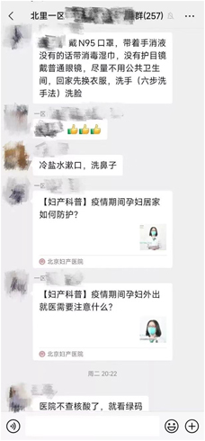 面对孕产妇及普通人群可能出现的发烧、咽痛、咳嗽等症状,除了积极用药,在和义街道不少居民志愿者积极在群里科普分享一些防护知识。其中,既有妇产医院医生在居民群里指导孕产妇如何做好日常产检及注意事项,又有居民志愿者在群里分享一些缓解患病症状的小妙招,还有居民在群里及时共享求医问药信息,帮助邻里解决购药难题。