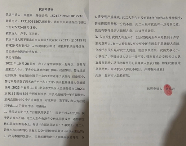 对于大兴区法院的这一判决,受害人张喜武不服,其认为大兴区法院的判决认定事实不清,对于两名嫌疑人的量刑过轻,经咨询律师后,于8月14日向北京市大兴区检察院提出抗诉申请书。其申请抗诉的理由有: