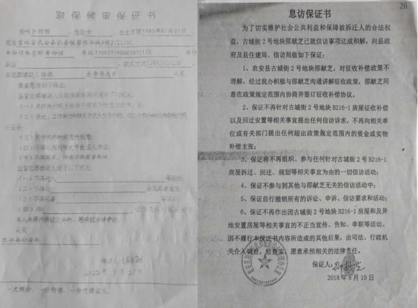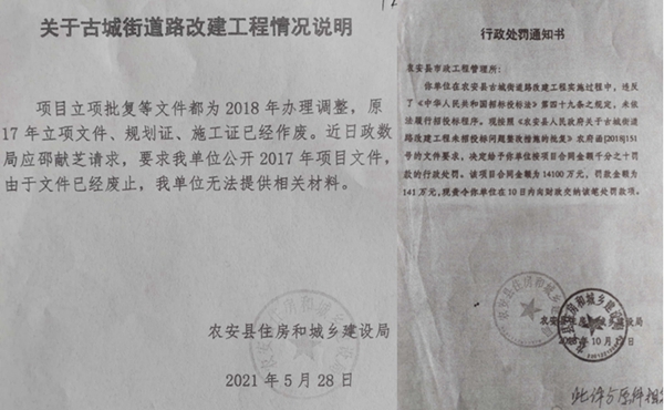 她还称,出狱后因为她屡次上访,农安县政府个别官员为了达到逼她息访的目的,曾对她儿子徐某采取过强制措施。2022年9月19日,时任信访局长,以解决问题为由将她骗到信访局,之后德彪派出所的民警就将她儿子抓走,虽然很快就放了回来,却为其办理了为期一年的取保候审,以其儿子为人质逼迫她签下了息访保证书。而这一切的一切都只不过是为了给一次不合法的强拆制造合法性。邵献芝提供的农安县住建局于2021年5月28日做出的《关于古城街道路改建工程情况说明》证实:古城街改造项目并没有合法手续。该说明称:“项目立项批复等文件都为2018年办理调整,原17年立项文件、规划证、施工证已经作废。近日政数局应邵献芝请求,要求我单位公开2017年项目文件,由于文件已经废止,我单位无法提供相关材料。”农安县发改委出具的文件还证明,施工单位根本就不具有相关资质。而农安县住建局2018年10月12日给农安县市政工程管理所的《行政处罚通知书》则证实,该单位在古城街道路改建工程实施过程中,未依法履行招投标程序!
