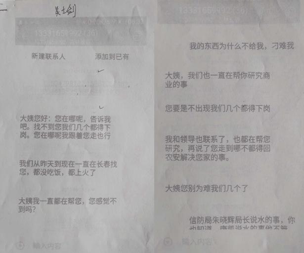 3、申诉人与拆迁办吴士剑的短信聊天记录,证明2017年9月29日上午10点50分申诉人正处在被管控之中,吴士剑给申诉人发拆迁办工作人员电话号,让申诉人把不上化肥的白菜给他老丈人家送点。拆迁办管控人员和当时在场的证人张晓杰证实我干了一天活,没有去案发现场。公安卷中魏阴珠的证言管控时间与新的证据吻合。公安机关所取的证人证言没有拿出依据和证据。另外,该短信聊天记录还显示,2017年10月13日11时44分之前,由于申诉人离开政府安排的管控人员,管控人员急切寻找申诉人并给申诉人发信息问申诉人在哪里,以及说找不到申诉人的话这些管控人员就下岗的情况,证明早在2017年9月28日之前申诉人就在被政府安排的人员管控的事实,根本不可能去案发现场。