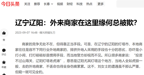 商家的竞争无处不在,但得靠正当手段。可是,在辽宁的辽阳的灯塔市,本地商家往往是容不下同行业外地商家的,排挤外地人采用的手段也十分的恶劣,恐吓是小打小闹,打打砸砸却是惯用手段,而当地警方却视而不见。所以很多商家说:“投资不过山海关,辽阳灯塔老虎滩”,意思是辽阳尤其灯塔这个地方,当地人全如虎狼一般,去的外地商家,不丢命也得全身伤痕累累。这不,刘女士的遭遇虽不那么严重,但窥一斑可见全豹。