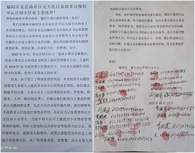 本站讯 2023年10月13日上午,陕西省榆林市榆阳区卓沁庄园小区广场上热闹非凡,北岳庙社区组织的卓沁庄园小区业主委员会选举正在举行。不过,随着选举的进行,令人感到乍舌和震惊的事情发生了:由于不认可社区列出的候选人名单,大多数业主和楼长拒绝参加投票,而社区则来了个“绝招”,组织社区工作人员和几名社会闲散人员挨家挨户“动员”业主和楼长投票。还有一些业主和楼长更爆料,如果他们不同意按照社区的意思选举,有人就会代替他们在选票上签字!这一公然违背社区管理相关规定和法律法规的恶行,竟然是发生在光天化日之下?!