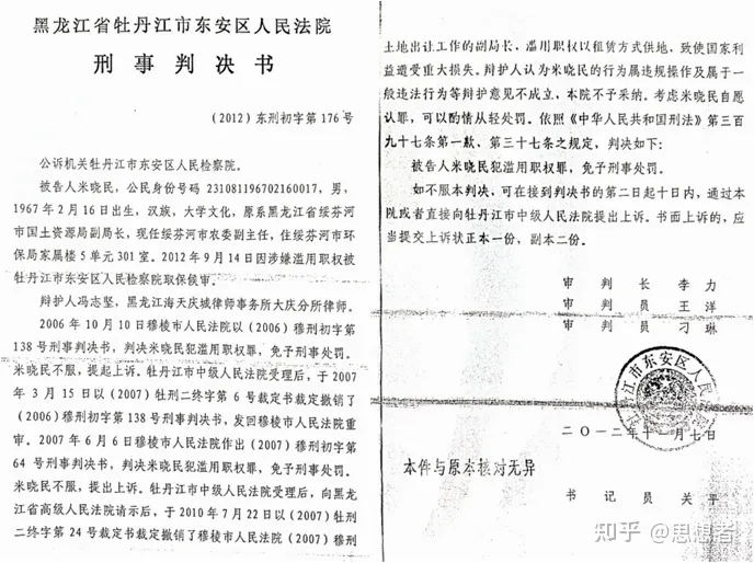 东安区法院阶段:2012年11月,悍然作出(2012)176号判决,再次判米晓民“犯滥用职权罪,免于刑事处罚”。