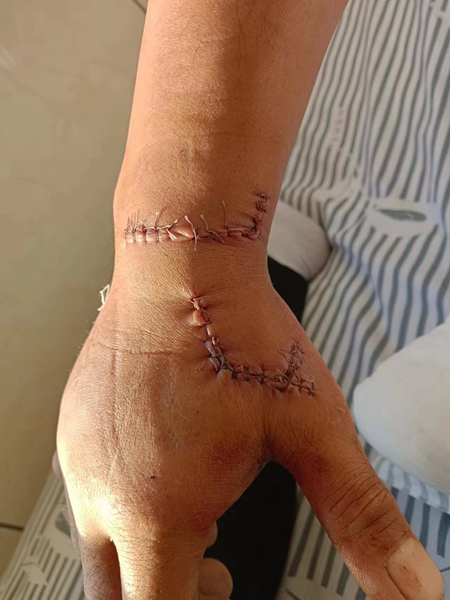 11月14日,张福平来到吉林大学第一医院乐群院区做了二次手术,20日出院。目前,张福平右手两处手术刀口,缝合长度16厘米左右,右手拇指打了石膏。
