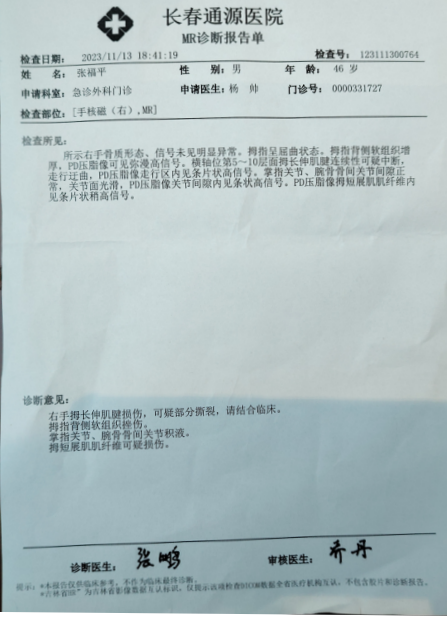 11月13日,张福平在长春通源医院做的MR诊断报告显示:张福平“右手拇长伸肌腱损伤,可疑部分断裂,请结合临床。拇指背侧软组织挫伤。掌指关节、腕骨骨间关节积液。拇短展肌肌纤维可疑损伤。”
