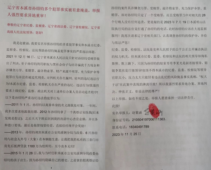我是赵紫涵,我要实名举报孙绍钧的多重犯罪事实和本溪市纪委、监察委、检察院、法院帮助孙绍钧掩盖犯罪事实的严重违法问题。2021年12月16日,本溪市人民法院只针对孙绍钧受贿罪做出了判决,至于孙绍钧利用职权与黑社会份子勾结诈骗我千万现金和涉嫌贪污罪、重婚罪、敲诈勒索罪、财产来源不明罪、充当保护伞等犯罪事实并没有被追究刑责,审判机关存在漏判、轻判的违纪违法行为!本溪市纪委、监委、检察机关存在严重的违纪、违法问题!我强烈要求上级纪检、监察、政法机关对上述单位办案人员启动追责程序!
