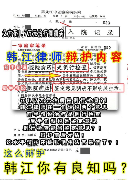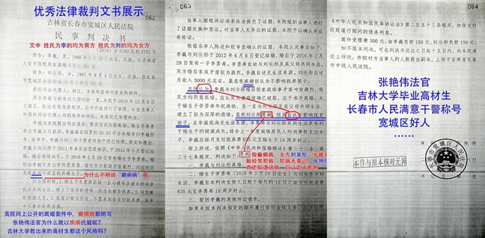 我到法律裁判文书网搜索癫痫病查到和我情况相同的判决,孩子在哺乳期的、双方有两个孩子的,都判给无癫痫病男方,而张艳伟法官的一审判决书中只字不提癫痫病,以患有疾病代替(网上公开的判决书中都写癫痫病,不涉及保护隐私,自学法律后我明白了原因),判决书结尾“本院认为”部分没有引用法条,却引用女方刘某(律师代说)“(刘某)自认为(患有的癫痫病)不影响抚育孩子”为依据将孩子判给女方抚养。