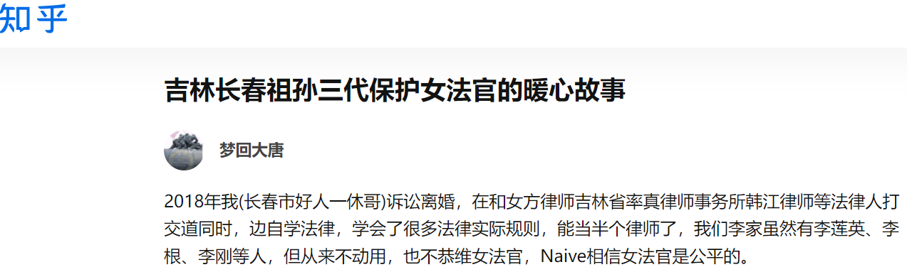 2018年我(长春市好人一休哥)诉讼离婚,在和女方律师吉林省率真律师事务所韩江律师等法律人打交道同时,边自学法律,学会了很多法律实际规则,能当半个律师了,我们李家虽然有李莲英、李根、李刚等人,但从来不动用,也不恭维女法官,Naive相信女法官是公平的。