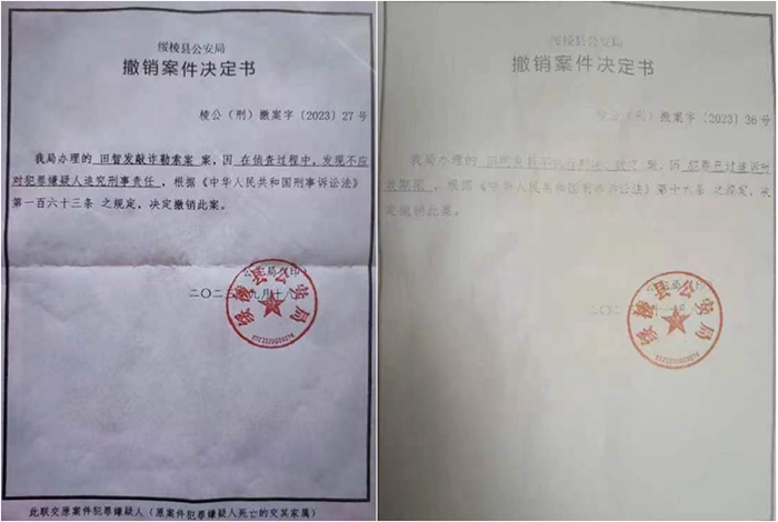 记者从田智发提供的绥棱县公安局2023年9月18日做出的撤销案件决定书(棱公【刑】撤案字【2023】27号)中,看到这样的证明:“我局办理的田智发敲诈勒索案,因在侦查过程中,发现不应对犯罪嫌疑人追究刑事责任,根据《中华人民共和国刑事诉讼法》第一百六十三条之规定,决定撤销此案。”