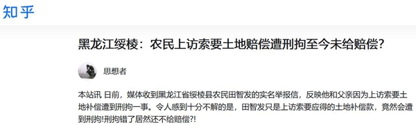 本站讯 日前,媒体收到黑龙江省绥棱县农民田智发的实名举报信,反映他和父亲因为上访索要土地补偿遭到刑拘一事。令人感到十分不解的是,田智发只是上访索要应得的土地补偿款,竟然会遭到刑拘!刑拘错了居然还不给赔偿?!