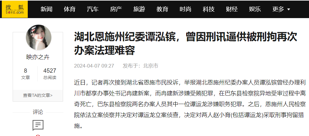 近日,记者再次接到湖北省恩施市民投诉,举报湖北恩施州纪委办案人员谭泓镔曾经办理利川市都享办事处书记冉建新案,而冉建新涉嫌受贿犯罪,在巴东县检察院异地受审过程中离奇死亡,巴东县检察院两名办案人员其中一位谭运龙涉嫌职务犯罪。之后,恩施州人民检察院依法立案侦察并决定对谭运龙立案侦查,决定对两人赵小育(包括谭运龙)采取刑事拘留措施。