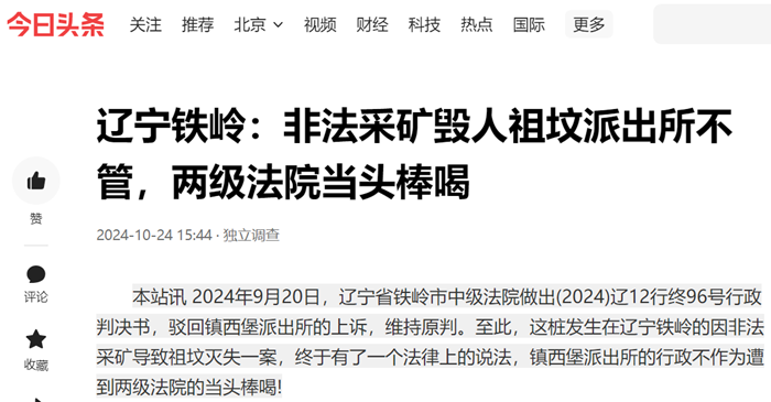 本站讯 2024年9月20日,辽宁省铁岭市中级法院做出(2024)辽12行终96号行政判决书,驳回镇西堡派出所的上诉,维持原判。至此,这桩发生在辽宁铁岭的因非法采矿导致祖坟灭失一案,终于有了一个法律上的说法,镇西堡派出所的行政不作为遭到两级法院的当头棒喝!