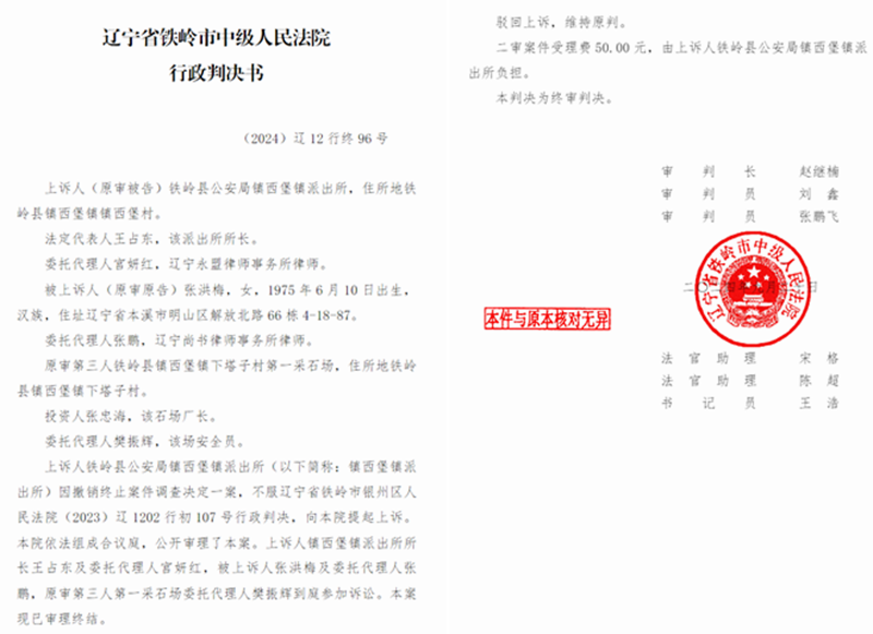 针对派出所的终止调查处理结果,张景林一家十分不满,他和家人多次前往派出所询问赔偿事宜。然而,他们发现派出所所长乔瑷珲在协调过程中百般阻挠,导致赔偿事宜一直未能得到解决。他们认为,派出所的做法明显是在袒护矿山,于是,愤然把派出所告上法庭。铁岭市银州区法院经过开庭审理,做出的(2023)辽1202行初107号行政判决书,认定派出所“终止调查决定的行政行为属于超越职权的行政行为”,“对被告的行政行为,不予支持。”法院判决:“撤销铁岭县公安局镇西堡派出所于2023年6月14日作出的铁公县(治)行终字(2023)3005号终止案件调查决定书,案件受理费50.00元由铁岭县公安局镇西堡派出所负担。”一审判决作出后,镇西堡派出所不服,上诉到铁岭市中级法院,该院审理后认为一审判决的结论正确,随即做出了(2024)辽12行终96号行政判决书,驳回镇西堡派出所的上诉,维持原判。