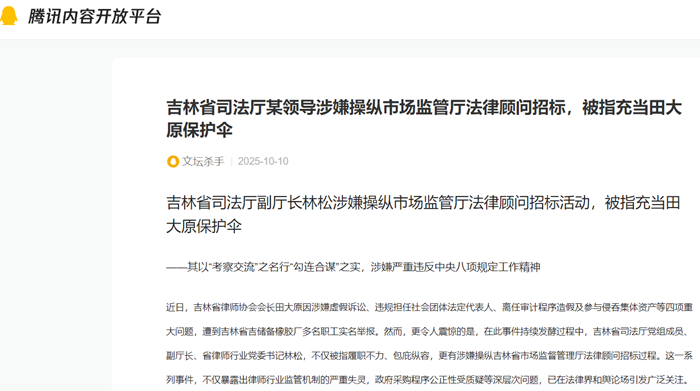 吉林省司法厅副厅长林松涉嫌操纵市场监管厅法律顾问招标活动,被指充当田大原保护伞