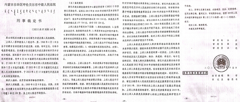 本站讯 “我只是为嘎查守护权属明确的草场,怎么就成了罪犯?”2025年12月16日,内蒙古呼伦贝尔市新巴尔虎左旗甘珠尔嘎查原嘎查达侯志平,手持两份边界重叠却均被政府认可的草原所有权证,声音沙哑却目光坚定。他介绍说:这场始于2019年的草场纠纷,本是行政确权混乱埋下的隐患,却在旗领导主持的协调会后,演变为针对牧民村官的刑事追诉。五年间,一审、发回重审、二审的司法轮回中,“双证并行”的权属迷局与“会议定调”的司法乱象交织,不仅让侯志平身陷冤屈,更直指权力干预司法、行政确权失范的深层症结。