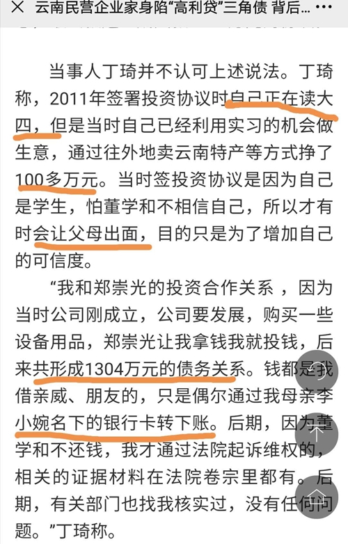 报道显示,举报人公开举报原云南省政府副厅级干部丁某某,与其正处级干部的妻子李某某(目前,夫妻两人均已退休),通过第三方机构发放巨额高利贷,获取高额利息,后又通过法院收回贷款本金及利息。其儿子小丁(简称)“勇挑重担”为父母揽责,称不是父母投的钱,是他投的钱。小丁还称,2011年投资企业480万入股,当时他在上大四,利用实习期间的机会经商挣了一百多万,包括和郑某某合作开公司,投入的1304万,都是他向亲戚、朋友借的,怕对方不信任他是个学生,所以有时候让父母出面或用母亲李某某的银行卡转账。
