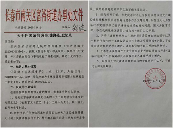 对于栾惠甥的多次举报和情况反映,长春市南关区富裕街道办事也多次作出信访答复,其答复的内容基本上是一样的。其中2020年5月13日的信访答复(长南富发[2020]9号)如下: