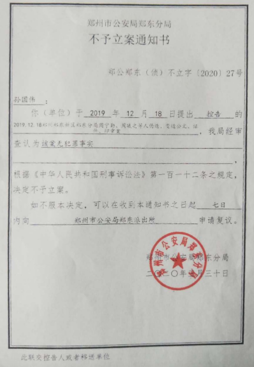 数亿资产被诈骗,受害人孙国伟恢复郑州铭康物业管理有限公司法人后在郑州市区两级公安局报案,八年报案至今以各种理由不予立案。