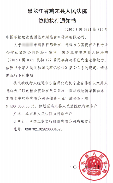 鸡东县法院协助执行通知书