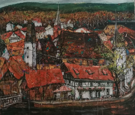 走近她的作品,就像走进一个世界,这个世界充满了阳光色彩、激情乐章,在画面的结构和色彩方面,走进自然,又不抄袭自然,既有主观处理,又有客观依据。在画面的表现形式上,不基于某种单一的形式,充分运用把控材料的特点,坦培拉、油彩、色粉笔、油画棒,丙烯等多种西方材料的综合叠加、处理、晕染、罩染、釉染等多种东方绘制手法的运用,使得画面既苍凉又温婉,既大气又神秘,即粗犷又细腻,其可看可品的内容很多。