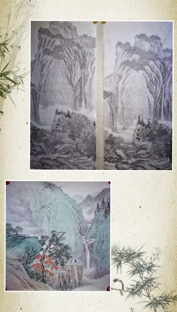 ⾃幼酷爱书画,⾃赋丑诗虽不成章,然也道出酷爱丹⻘的浪漫情怀。尤为喜欢中国传统⼭⽔画,描绘娇丽壮美的⼤好河⼭,并⼤量研习临摹北宋范宽、刘松年等诸多古代⼤师的作品。师尊古源,通过临摹掌握笔墨技法,掌握构图、透视、设⾊运⽤等规律之后,在到⼤⾃然中体验⽣活,游览祖国的⼤⼩名川。