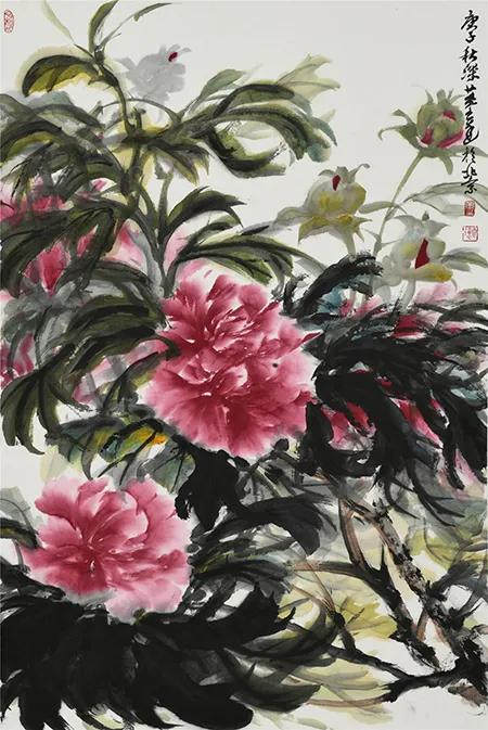 在我看来,董良达的艺术风貌其独特之处,一是他敢于打破传统题材的窠臼,大胆开创“化新入古”。 他将当代人很少画的草莓纳入自己的国画题材,体现了“笔墨当随时代”的创新精神。 他笔下的草莓,线质极具传统功力,而构图和用色则体现出浓郁的生活气息,充分展示了扎根生活的艺术精神。 二是大胆将金色运用于国画山水,创作出了金顶群峰的崭新意象。 在他笔下,巍峨的太行沐浴于金色朝晖之中,作品气势雄伟,神采焕然。 他在中国传统文人画中大胆探索,开出了自成一家的山水画新境。 三是开创了自家牡丹图精神意象。 自李唐以降,世人多爱牡丹,然往往不得牡丹雍容高贵之精神,每每将牡丹画得过于艳俗。 然而良达深谙祖父董寿平所传“外师造化,中得心源”的心法,大胆探索,直取牡丹之精神。 其笔下的牡丹无半点胭脂气息,有一股倔铁风采,天真洒脱、自信烂漫! 他将牡丹精神画得“入世”而又“傲世”,塑造出了牡丹独特的精神气象。