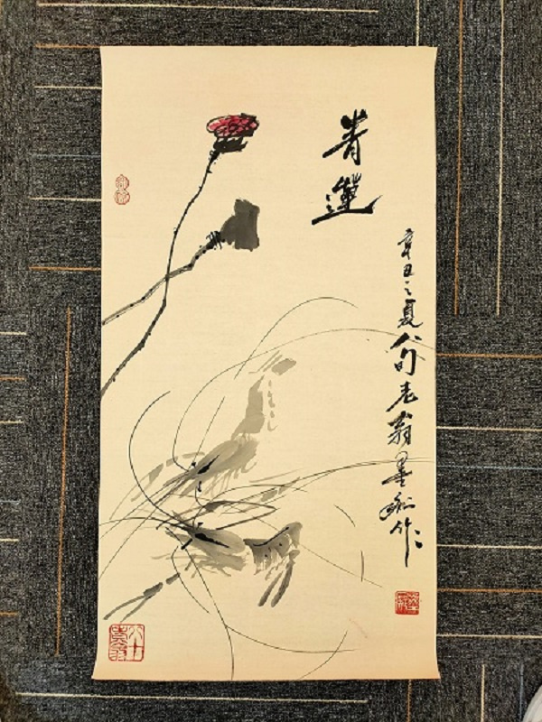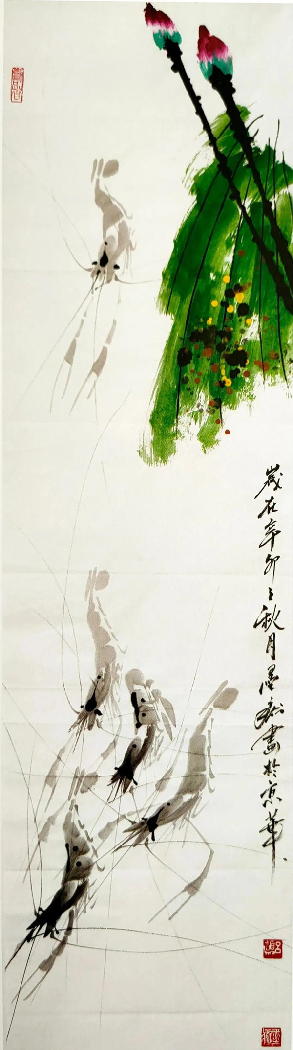 更有甚者,鉴赏大师史树青也亲自为他的《百虾图》题写“墨痴大师百虾图”之字,并又分别为他的两幅画作了题款:“墨痴先生写虾大有白石老人韵致,用墨深浅可分五色,白石不能为也”;“墨痴先生精于大幅,白石老人无此翰墨……”如此赞赏之词实在难以复加。