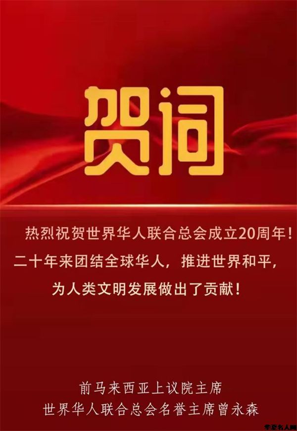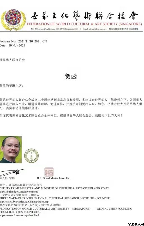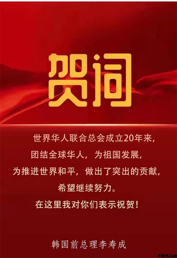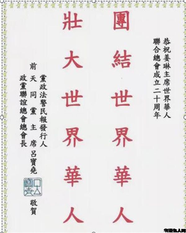 今年是世界华人联合总会成立二十周年。在世华会成立20周年庆典上,世华会主席姜琳女士做了《团结全球华人、促进世界和平》的精彩报告。首先姜琳主席通报了两件事:一是鉴于王景清同志对华人事业的一贯支持,经世界华人联合总会常务理事会研究决定:追授王景清同志为世界华人联合总会终身名誉主席!二是代表世华会全体同仁向全球所有支持华人事业的人们表示感谢。同时特别提出向为了华人事业,做出突出贡献的庄世平、陈香梅等华人领袖表示感谢的同时,送上我们永久的怀念!