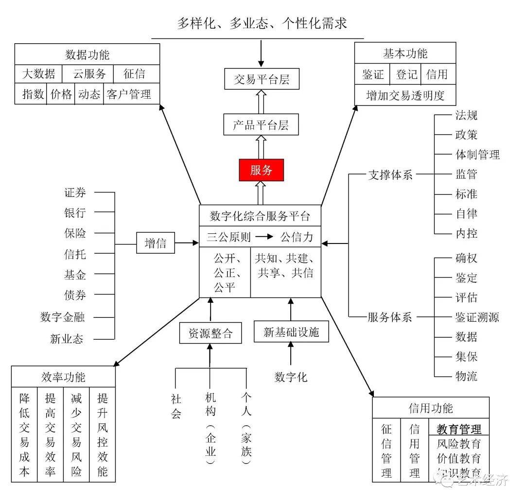 数字艺术品综合服务平台不是原来的功能性平台,而是以数字化为基础,基于新基础设施的平台建构。在数字化的基础上,平台的形态已经发生了巨大的变化,即由基于一般传统交易的平台形态向基于以数字化为基础的综合平台形态转向,其建构既是一个过程,又是一个系统与体系,基本框架为:通过平台核心价值层,即“七公(共)”原则(公开、公正、公平、共治、共建、共享、共信),强调平台的生态性;通过增信融合证券、银行、信托、保险、基金、债券及新业态等各金融业态;通过服务聚合艺术金融产业的支撑体系,如数据、征信、确权、鉴定、评估、集保、物流等;通过大数据与服务提供市场指数、价格、动态及征信等信息服务;通过信用管理功能提供征信管理、信用管理、风险、价值、知识教育等信用服务;通过新技术融合支撑业态创新;通过资源整合实现社会、机构与个人的资源融合;通过信息对称共享实现降低交易成本、提升交易效率、减少交易风险、提升征信效能的平台优势;通过提升交易过程信息的透明度,实现平台的交易鉴证、信用管理、登记功能。在互联网与金融的融合下,除了基本功能与数据服务,数字综合服务平台更强调综合服务,即功能的综合化、复杂化、专业化,并在新技术融合的支撑下,增加了征信功能,形成以征信为基础,信用管理为中心的运营体系,在数字化平台上,最重要的是数字化场景,最主要的是以客户为中心、以信用管理为核心,其主要交易标的是数字化资产,包括数字性资产、内容性资产、复合性资产、数据性资产。在数字新基础设施和数字化场景下,这些数字化资产表现为非标性资产,由于其认可度高,只要在合规合法的平台上按照规范操作,就可以做到交易安全快捷、交易成本低、参与者广泛(具体见图5)。