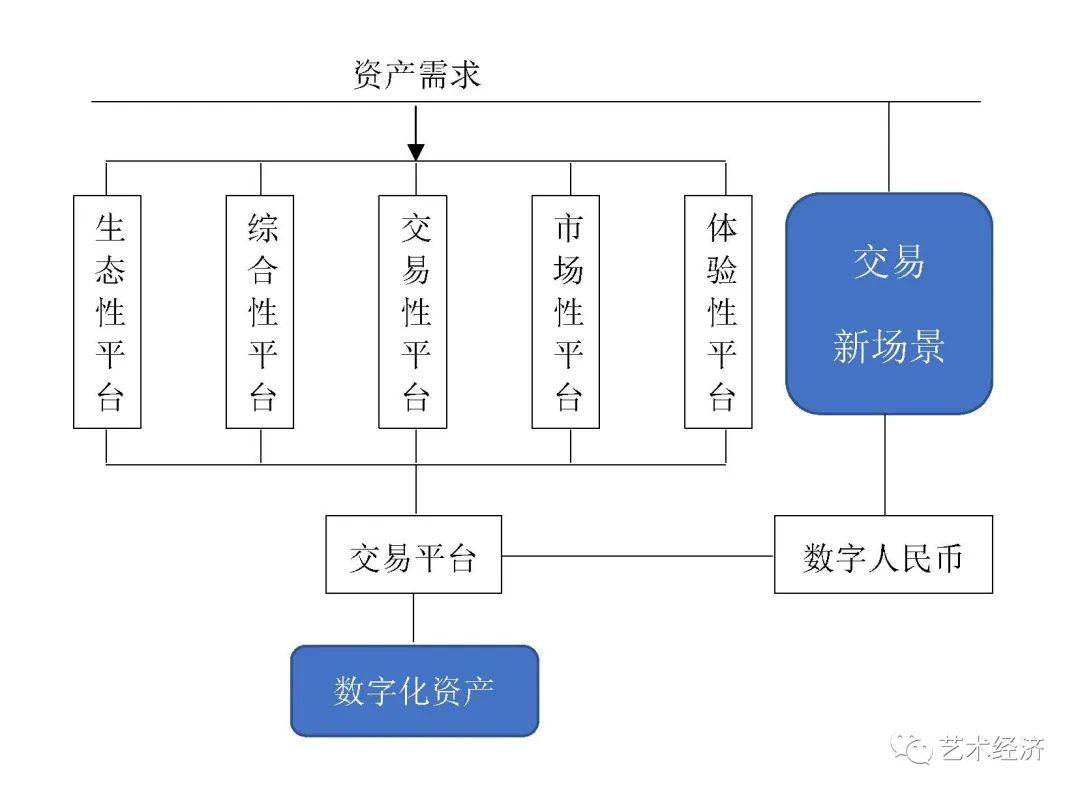 基于数字化场景与新基础设施的综合服务平台的建构,与传统意义上的综合平台的建构具有非常大的不同,最关键的就是平台的功能、平台的运营、平台的服务标的、平台的支撑服务等都已经发生了重要的变化,可以说是一个新的形态意义上的综合服务平台。在交易的过程中,为满足交易双方不同的需求,目前已有的平台包含以下几种:生态性平台(例如阿里、京东、腾讯等)、综合性平台(例如文交所)、交易性平台(如各类网络商城等)、市场性平台(例如画廊、拍卖平台)、体验性平台(线上线下的体验场景)等。这些平台的建构和实施,是建立在数字化资产的基础上,随着数字人民币的推广,更需要建立适应于数字化货币交易的新的交易平台(具体见图6)。