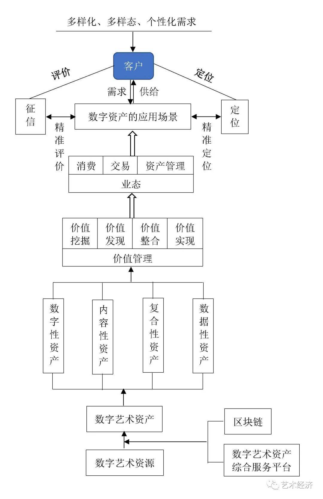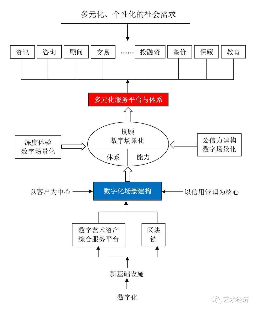(4)在新基础设施的基础上建构数字化场景,最终满足多样化、多样态以及个性化的需求为导向的目标,实现数字艺术金融服务的最终效能。根据多样化、多样态、个性化的需求,以提供相应的产品与服务为手段,建构数字化场景,来进一步满足社会对艺术金融服务的需要,是数字资产为核心的艺术金融服务及其体系发展最终的方向与目标。所以,在这里我们要关注数字化—新基础设施—数字化场景—产品与服务创新—多样化、多样态、个性化的需求这一个基本的逻辑主线。