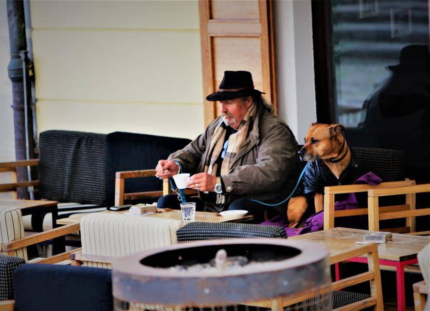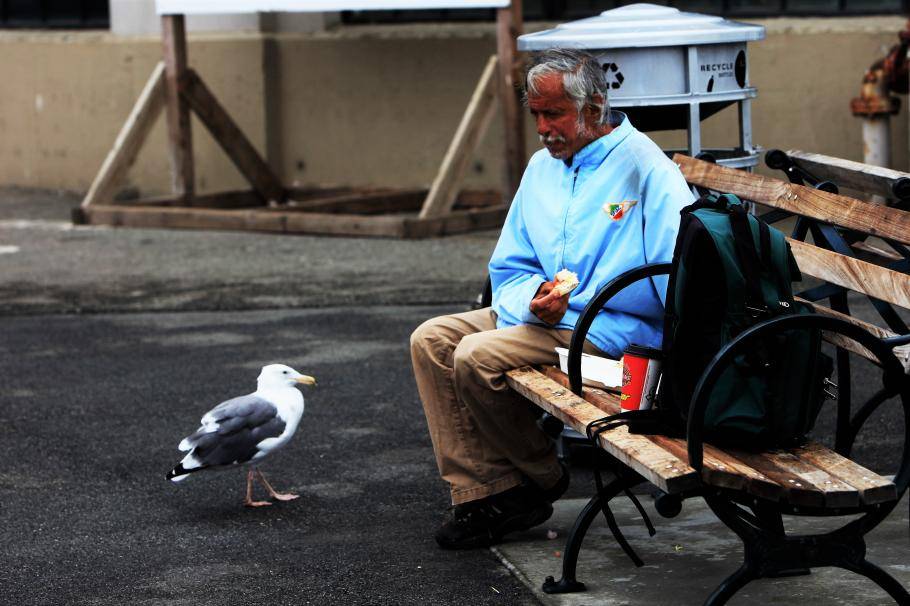 慈悲的心。欧洲,街头长椅上,秋风萧瑟,一位年长的旅行者手拿干瘪的面包,深情地望着面前孤独的鸭子,不时与鸭子分享已经不多的面包。旅行包放在身边,是归来,亦或是启程?