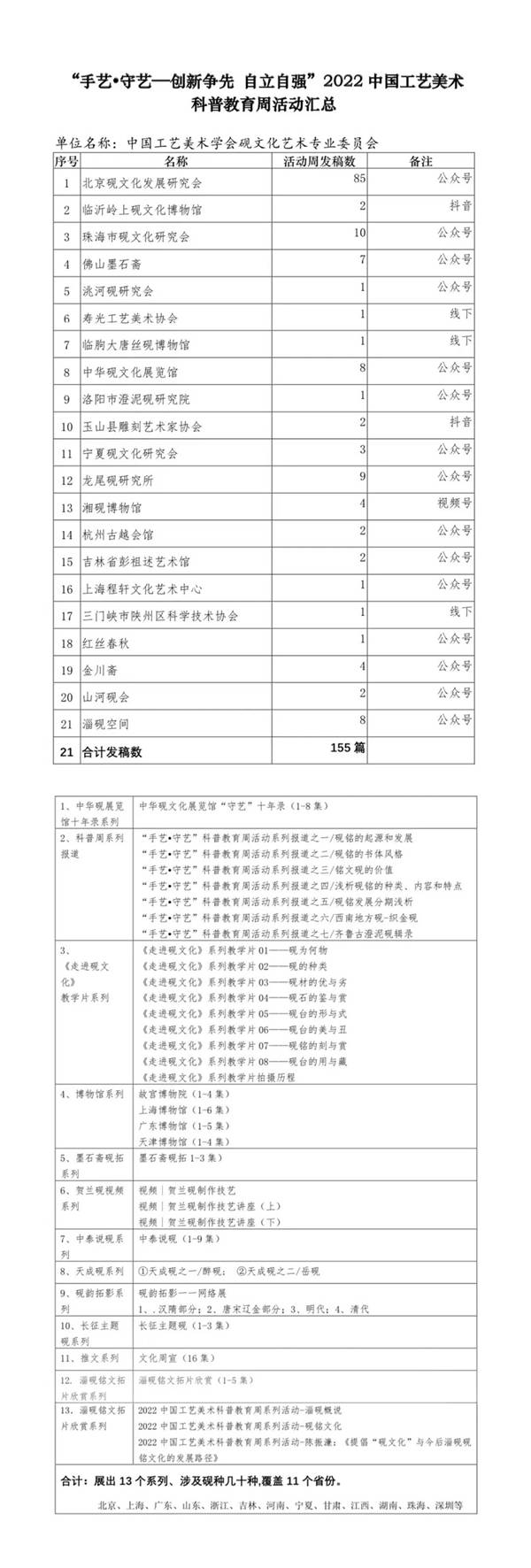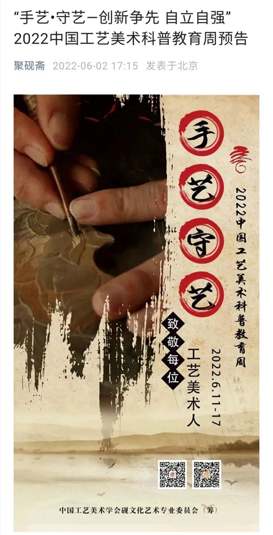 6月18日,为期一周的“手艺•守艺—创新争先 自立自强”2022中国工艺美术科普教育周活动圆满收官,首次作为新筹建的中国工艺美术学会分支机构一一中国工艺美术学会砚文化艺术专业委员会甫一亮相,便有了惊艳的表现,据不完全统计:科普周活动共联合21家机构,发稿155篇,展出13个系列、涉及砚种几十种,覆盖11个省份。