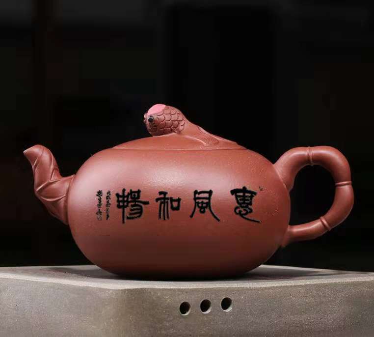 黄中先生在宜兴紫砂壶上题写:惠风和畅。