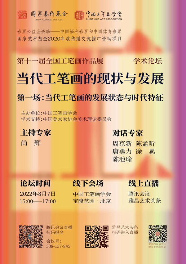 由中国美术家协会、中国美术馆、中国工笔画学会共同主办的“第十一届全国工笔画作品展”,是2020年度国家艺术基金资助项目。因为疫情影响,一直延迟到2021年4月首展终于在中国美术馆开幕,分“特邀参展单元”和“全国征稿单元”共展出431件大尺幅工笔画作品,在主展馆中国美术馆和分展馆81美术馆同步展出。2021年8月开始,又精选出170件优秀作品在深圳关山月美术馆、上海中华艺术宫、江苏省淮安市美术馆巡回展览。该展览的高规格、大体量、高学术在全国引起强烈反响,引爆了“后疫情时代”新一轮观展热潮,让“当代工笔画”再次成为美术界热议的话题。同样因为疫情影响,作为本次大展的一个重要组成部分,原计划在巡展美术馆同步展开的专题学术论坛,也被迫一次次延期,最终决定在2022年8月以线下结合线上形式全面展开。