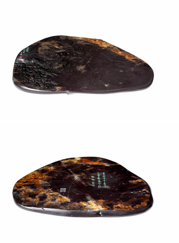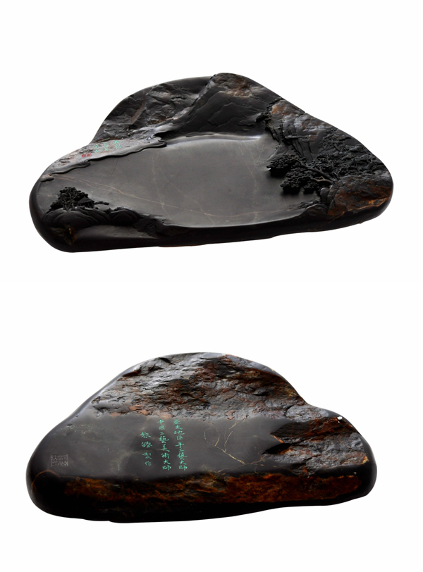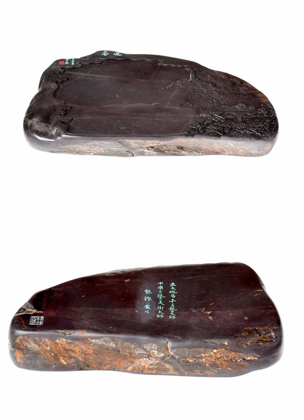 此长征主题砚雕刻的二十二方砚台,材质均选用源自广东肇庆西江流域的老坑端石,选材坚润华美之上乘,砚堂设计与主题构图之巧妙,砚雕刻画工艺手法之精湛,红色意蕴与笔墨造境之审美,实为首开中国工艺美术界历史之先河。黎铿、杨焯忠两位制砚大师均擅长砚艺的山水造境,在创作长征主题砚雕刻艺术的合作上做到了珠联璧合,因材施艺,求同存异,相得益彰。从雕刻技艺的表现手法上便可感知到两代艺术大师间技艺传承与文脉相通。