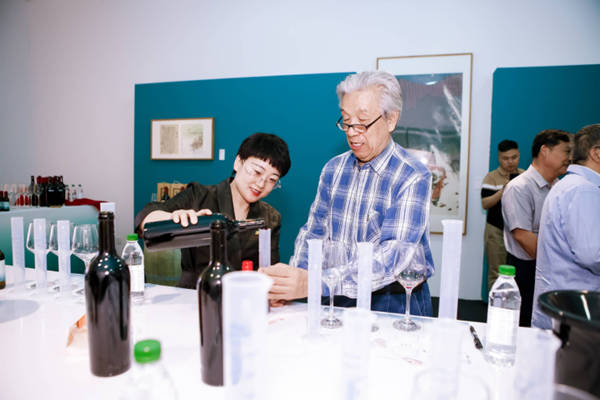 随后,在策展人陈远志的带领下,众嘉宾进入自由观展环节。现场由长城资深酿酒师为嘉宾进行调酒并讲述葡萄酒酿造、品鉴等相关知识,酒杯与乐音成趣。这些随展览展示而衍生出的体验、感知、参与、交流活动,使展览现场不再只是提供作品展示的空间,而开始融合展品与展品故事、展品故事与创作者、创作者与创作经历等进行多维的融合表现和多元的互动沉浸,使展览形式更加灵活,使展出内容更加丰富,使观展体验更加鲜活。