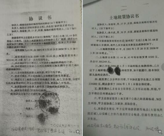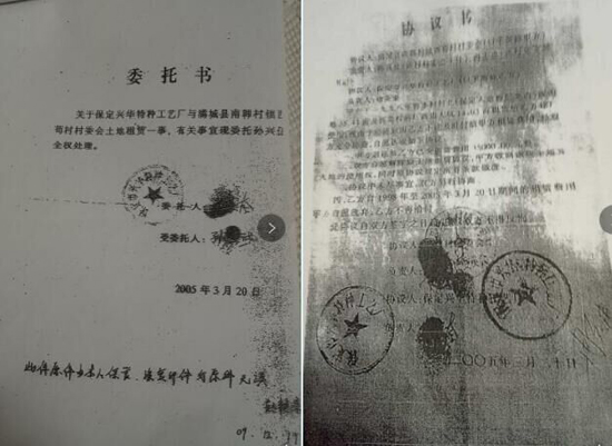 就是在这一天,我们收集到的有如下材料:一是保定市兴华特种工艺厂委托孙某武全权处理土地租赁一事和委托书;二是满城县南韩村镇西苟村村委会与保定市兴华特种工艺厂解除土地租赁协议书;三是满城县南韩村镇西苟村村委会与张某增签订的土地租赁协议书;四是张某增与孙某武签订的土地转租协议书;五是孙某武与唐英奎签订的抵债还款协议书。