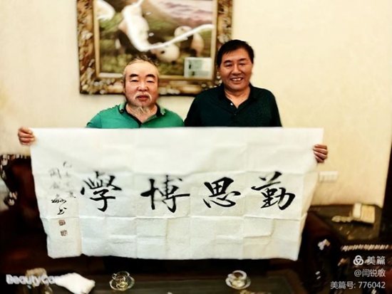 硬笔楷书书写人闫锐敏(左)和本文作者李学文。