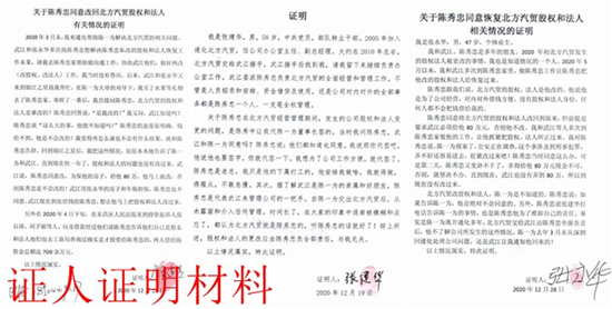 附主要证据:1、省委巡视组交接单;2、吉林迪安司法鉴定中心字迹鉴定结论(证明股权及法定代表人变更非陈一为字迹);3、武江出具的证明材料(证明陈一为不知情);4、张建华出具的证明材料(证明陈秀忠安排其伪造签字更改股权法定代表人);5、崔连杰证明材料(证明陈秀忠承认更改股权法定代表人);6、张永华证明材料(证明陈秀忠承认同意恢复更改的股权、法定代表人,并敲诈80万元的事实);7、通化市公安局刑事复核决定书。