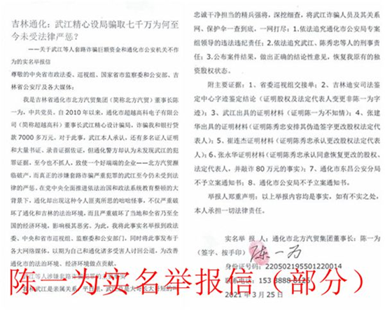 我是吉林省通化市北方汽贸集团(简称北方汽贸)董事长陈一为,中共党员。自2010年以来,通化市超越高科电子有限公司(简称超越高科)董事长武江精心设计骗局,诈骗我和银行贷款7000多万元。对于此事,武江本人承认,还有多名证人证明和大量书证、录音证据佐证,但通化警方却认为未发现武江的犯罪证据,至今也不抓人,致使一个好端端的企业——北方汽贸濒临破产,而真正的涉嫌套路诈骗严重犯罪的武江至今仍未受到法律的严惩。在党中央全面推进依法治国和政法系统教育整顿的大背景下,通化却出现这种令人匪夷所思的咄咄怪事,不仅严重破坏了通化和吉林的法治环境,而且严重破坏了当地和全省乃至全国的经济环境,影响极其恶劣。为此,我将此事实名举报到政法委、中央和省市巡视组、监察委和公安部门,同时将此事发布于各大网络媒体,以期为自己和通化诸多受害人讨回公道,为改善通化市的法治环境、经济环境做点贡献。