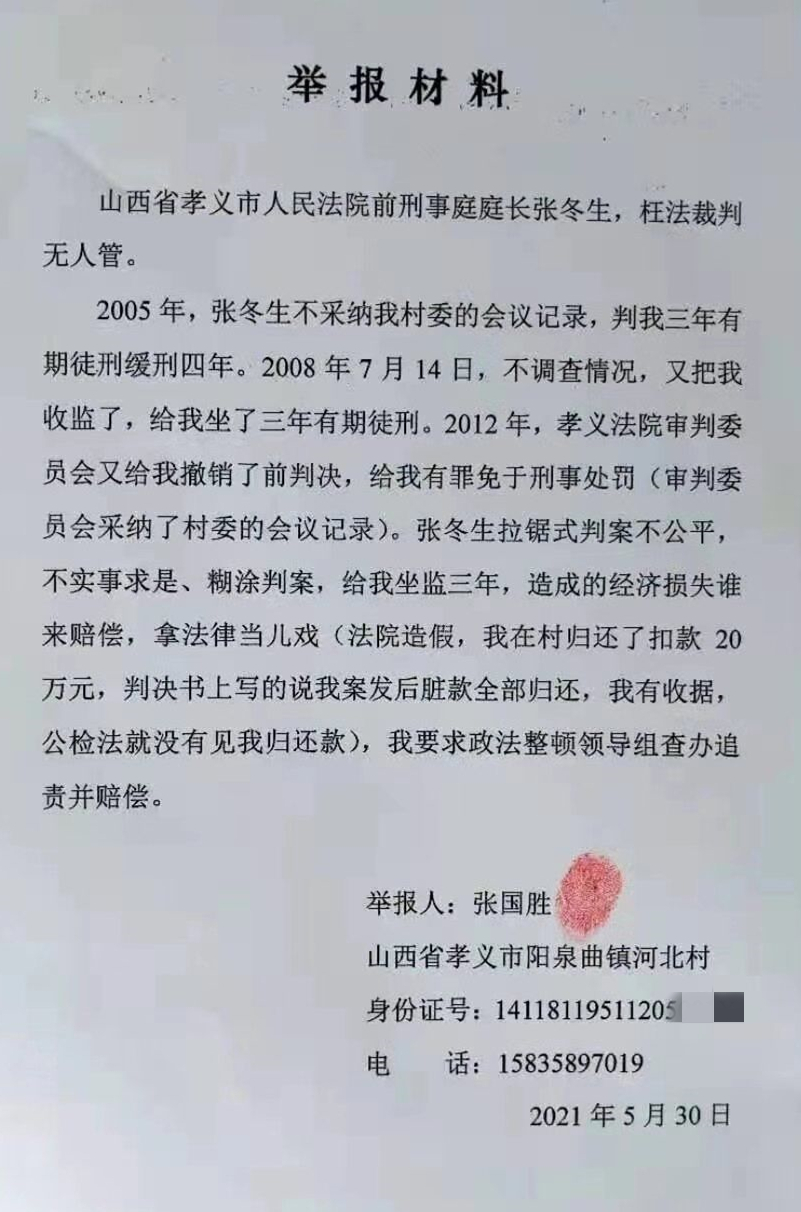 2005 年,张冬生不采纳我村委的会议记录,判我三年有期徒刑缓刑四年。2008年7月14 日,不调查情况,又把我收监了,给我坐了三年有期徒刑。2012年,孝义法院审判委员会又给我撤销了前判决,给我有罪免于刑事处罚(审判委员会采纳了村委的会议记录)。张冬生拉锯式判案不公平,不实事求是、糊涂判案,给我坐监三年,拿法律当儿戏(法院造假,我在村归还了扣款 20万元,判决书上写的说我案发后脏款全部归还,我有收据,公检法就没有见我归还款),我要求政法整顿领导组查办追责并赔偿。