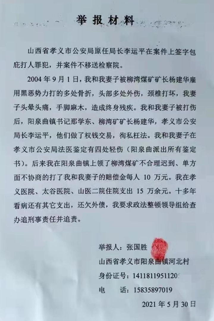 2004年9月1日晚,因村委公事,我和我妻子被柳湾煤矿矿长杨建华雇佣黑恶势力殴打,导致我多处骨折、头部 30多处伤,颈椎打坏,我妻子头晕头痛,手脚麻木造成终身残疾,我和我妻子被打后,阳泉曲镇书记那学东、柳湾矿矿长杨建华、孝义市公安局局长李运平,他们做了权钱交易、徇私枉法,公安局局长李运平在案件上签字包庇,案件不移交。