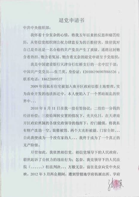 张兰英:女,1969年7月8日出生,天津市南开区人,天津市南开区鞍山西道美湖里2号楼6门603号公民,天津市南开区鞍山西道时代宾馆103号居民(被当局强行数年扣押居住),原中国建设银行天津市红桥支行中层干部,维权公民,天津公开发布退党声明第一人,人权捍卫者,中国在押维权人士。