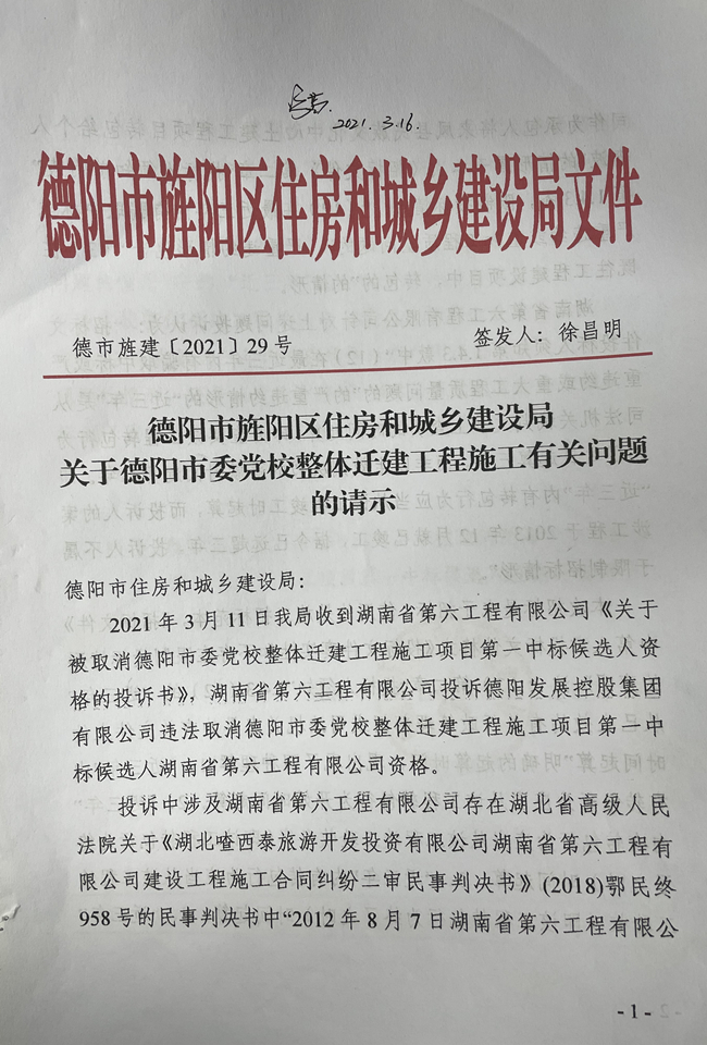 突然,2021年3月31日,业主方德阳发展控股集团有限公司(德阳发展)说,已报经旌阳区住建局裁定,现通知:经核实,你公司(湖南六建)在本项目存在招标文件投标人须知第1.4.3(12)在最近三年内有骗取中标或严重违约或重大工程质量问题的情形,所以取消你公司本项目第一候标人资格。